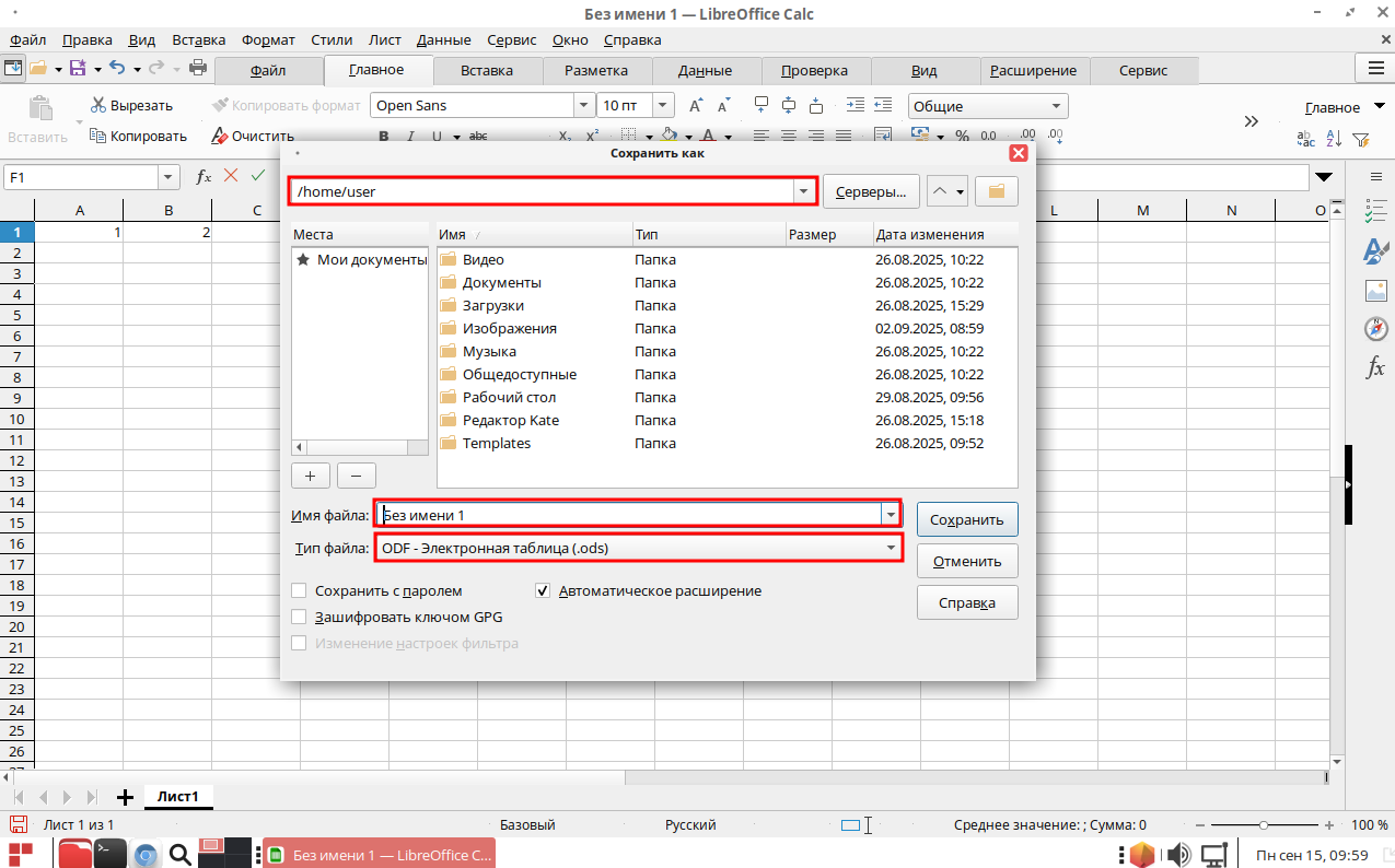 Для сохранения документа по умолчанию нажмите сочетание клавиш Ctrl + S либо кликните на иконку «Сохранить» на «Панели инструментов». Формат сохранения документа по умолчанию - .ods.