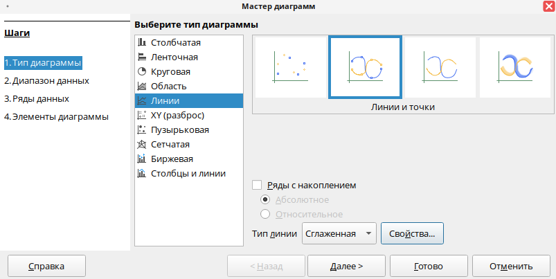 В появившемся окне «Мастер диаграмм» выберите тип диаграммы «Линии», выберите «Тип линии» - «Сглаженная» и нажми кнопку «Готово». В окне LibreOffice Calc под таблицей данных появится автоматически созданный график: