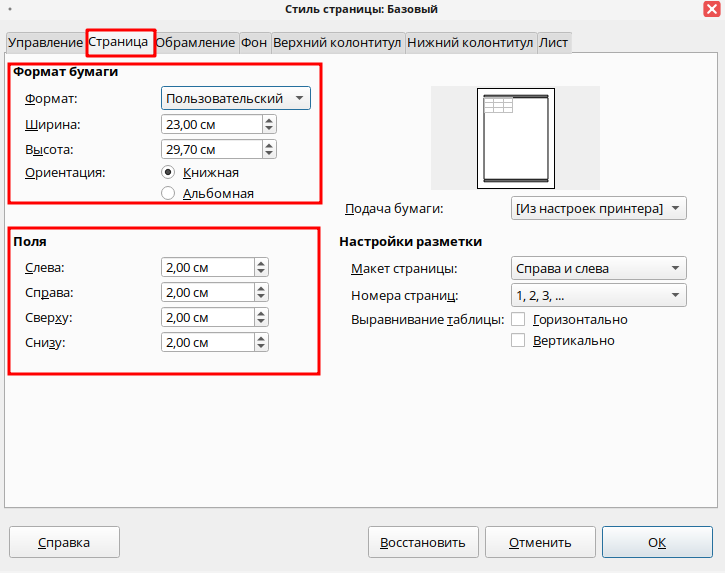 Во вкладке «Страница», в разделе «Формат бумаги» задайте необходимую ширину и высоту страницы и поля.