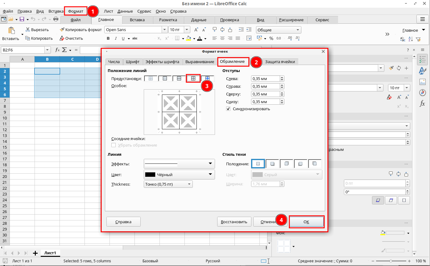 Для выполнения расчета и его описания выделите ячейки электронной таблицы в пределах 5-ти столбцов и 5-ти строк. Далее перейдите в меню «Формат» - «Ячейки». В открывшемся окне «Формат ячеек», во вкладке «Обрамление» выберите параметр «Внешние и все внутренние линии».