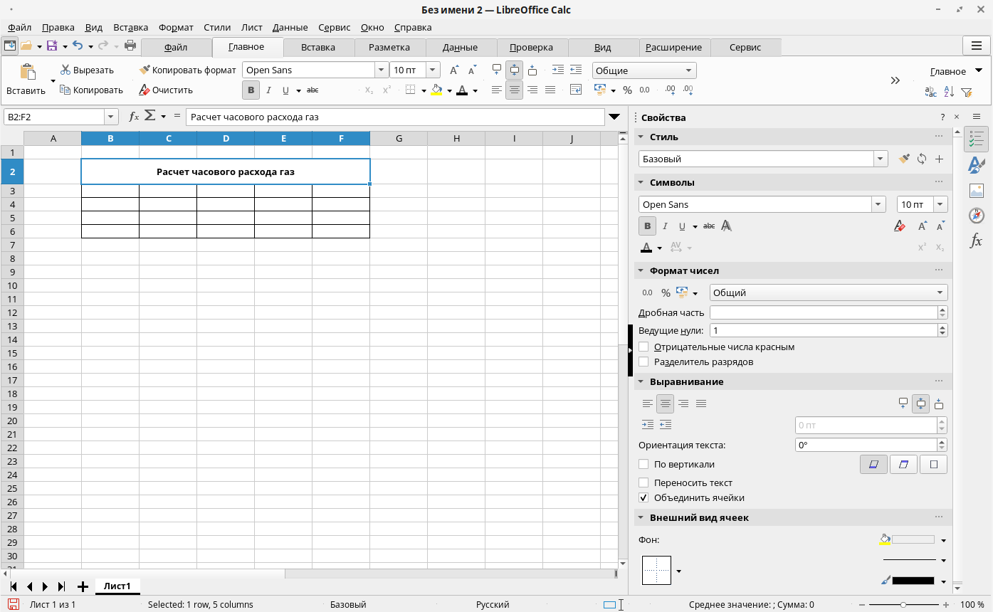 Объедините ячейки верхней строки в одну и пропишите в ней заголовок таблицы-расчета. Для объединения нескольких ячеек в одну выделите ячейки при помощи ЛКМ либо используйте для выделения ячеек клавиши Shift + ↓, ↑, ←, → перейдите в меню «Формат» - «Объединить ячейки».