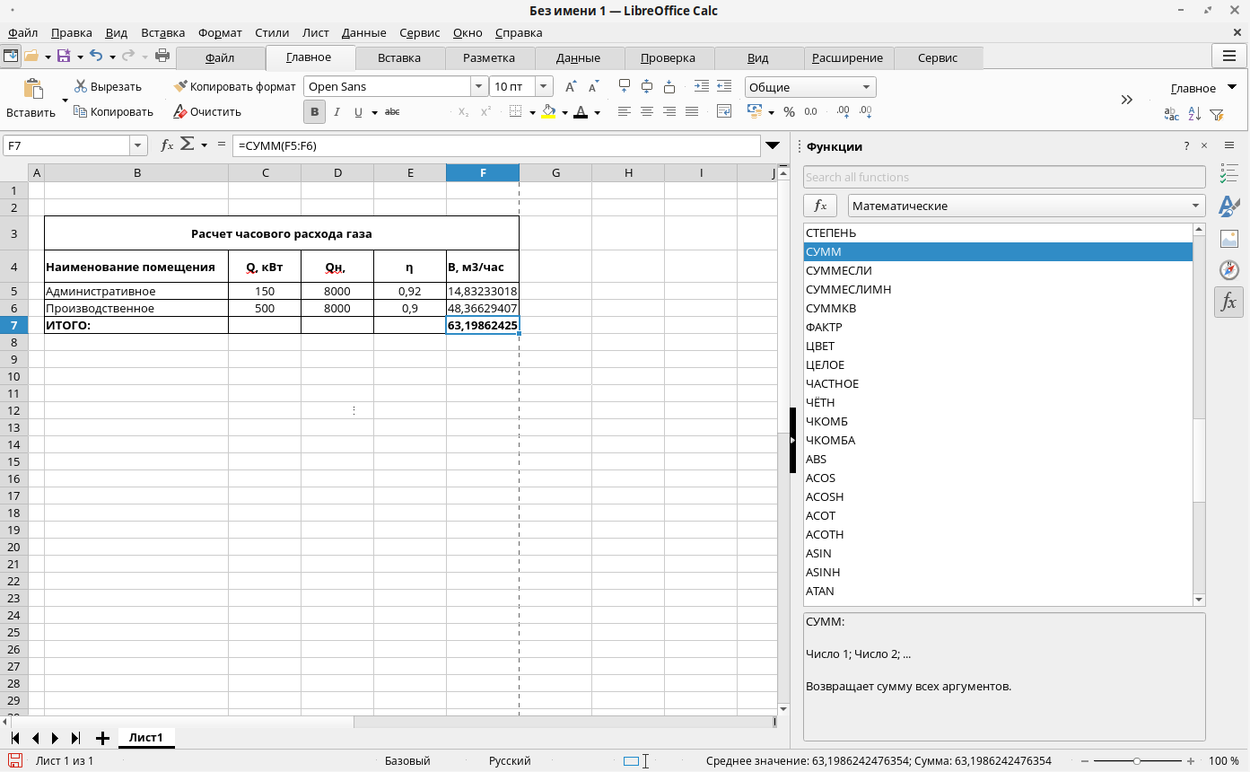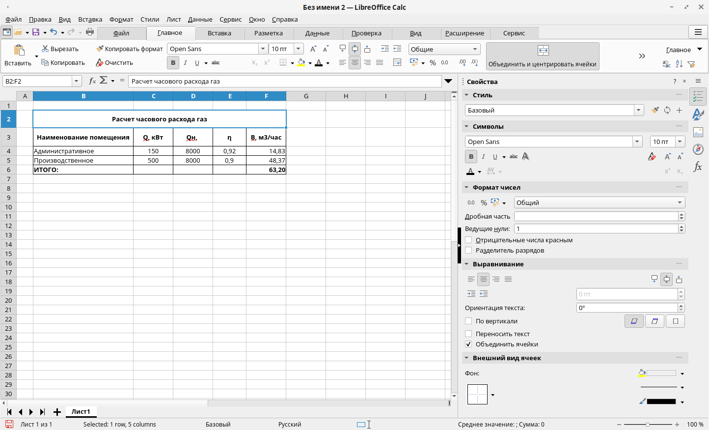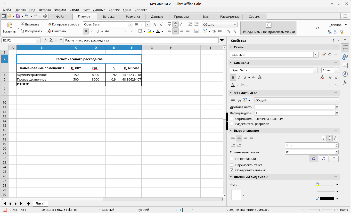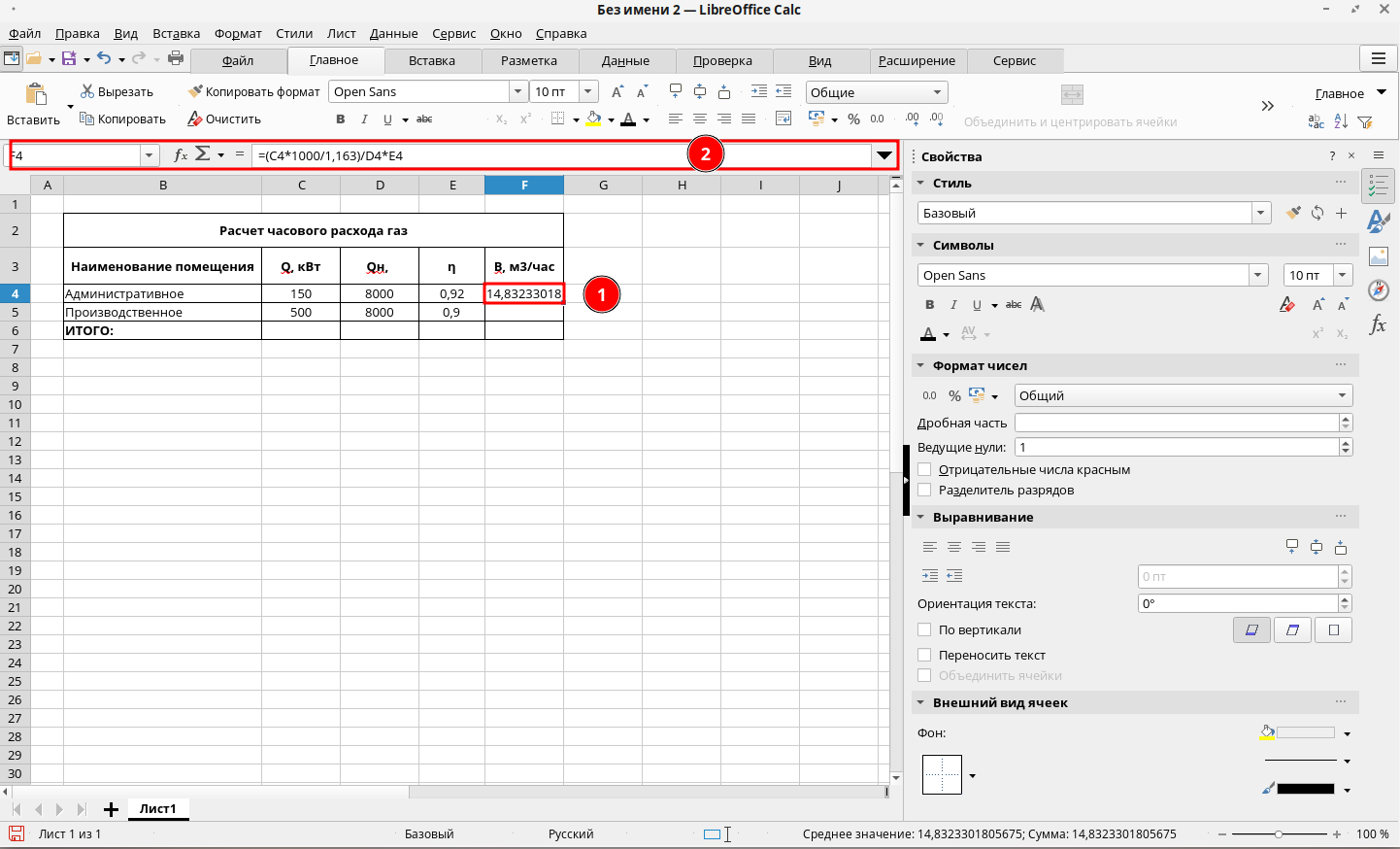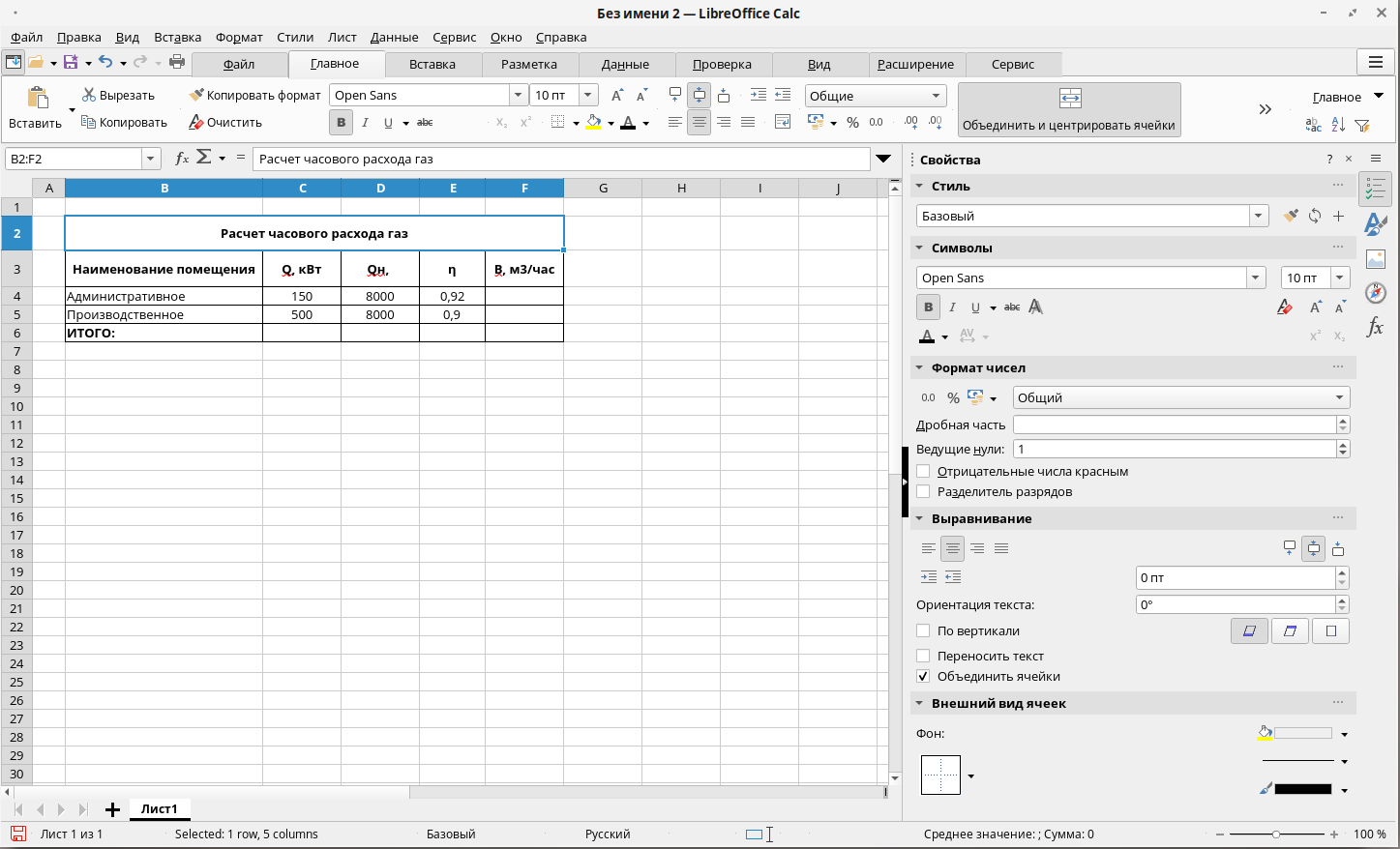 Рассмотрим пример создания таблицы для расчета часового расхода газа.