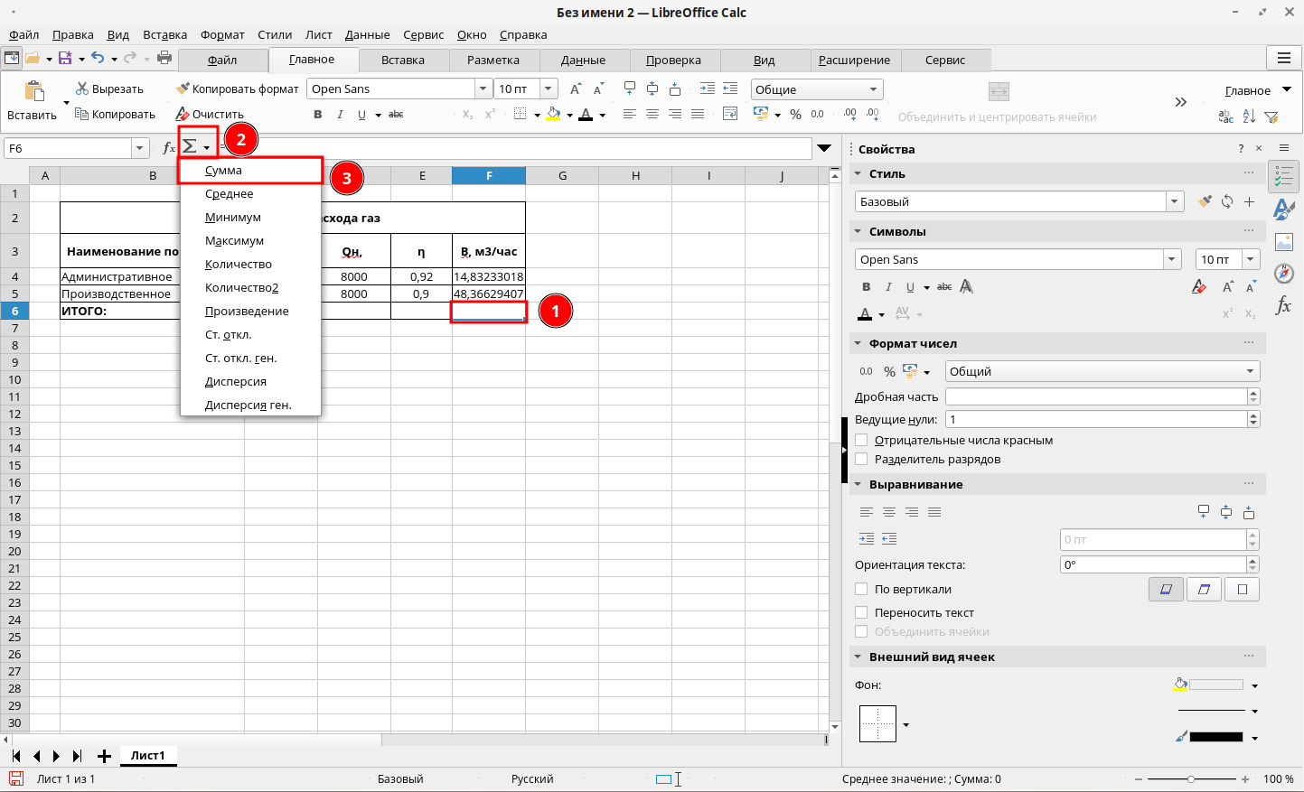 Для получения суммы значений двух строк в столбце «F» выделим ячейку «F6». Далее на «Панели формул» в выпадающем меню для кнопки «Выбор функции» выберите параметр «Сумма».