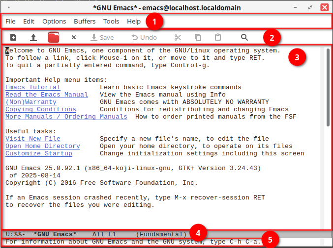 1. Меню — в верхней части окна находится строка меню (File, Edit, Options, Buffers, Tools, Help);