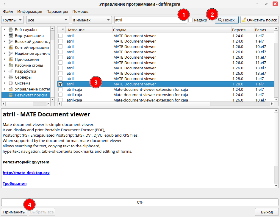 Для установки программы через графический менеджер пакетов dnfdragora перейдите в «Главное меню» — «Администрирование» — «Управление пакетами dnfdragora», выполните поиск необходимого пакета по ключевому слову «atril» и отметьте флагом пакет последней версии. После этого нажмите кнопку «Применить» и дождитесь окончания установки пакетов.