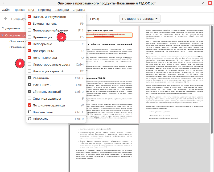 Имеется возможность просмотра документа в режиме презентации (5), а также поддерживается функция инвертирования цвета (6).