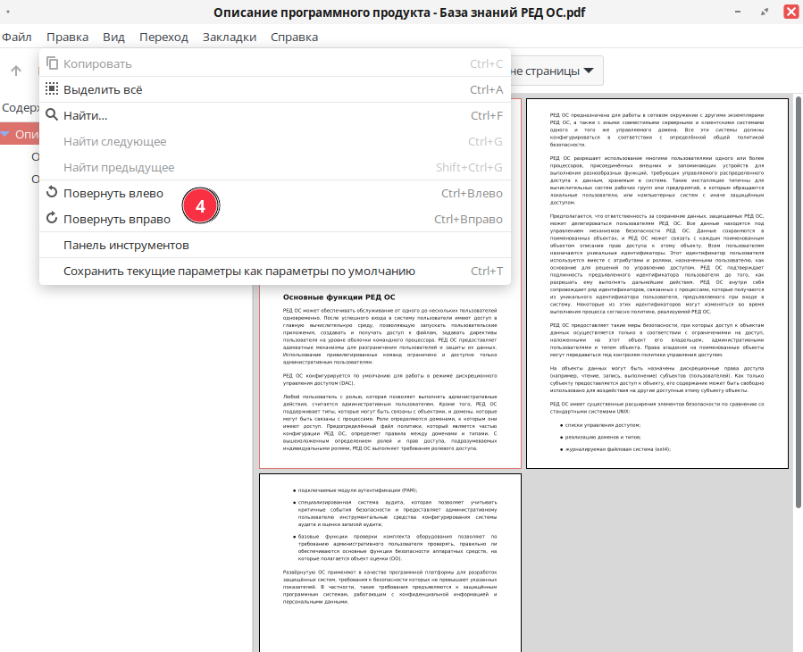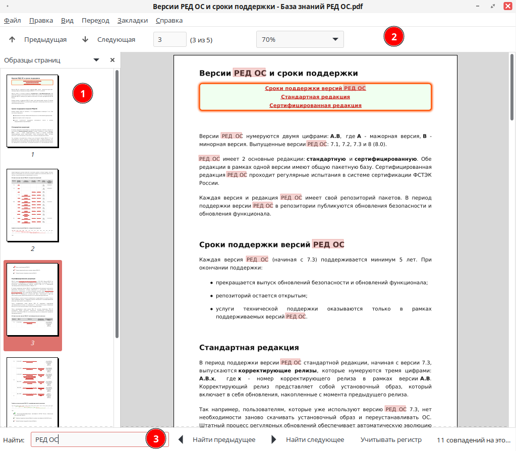 Функция поиска по тексту документа (3) вызывается сочетанием клавиш Ctrl+F. Программа показывает количество найденных результатов, подсвечивая их на странице.