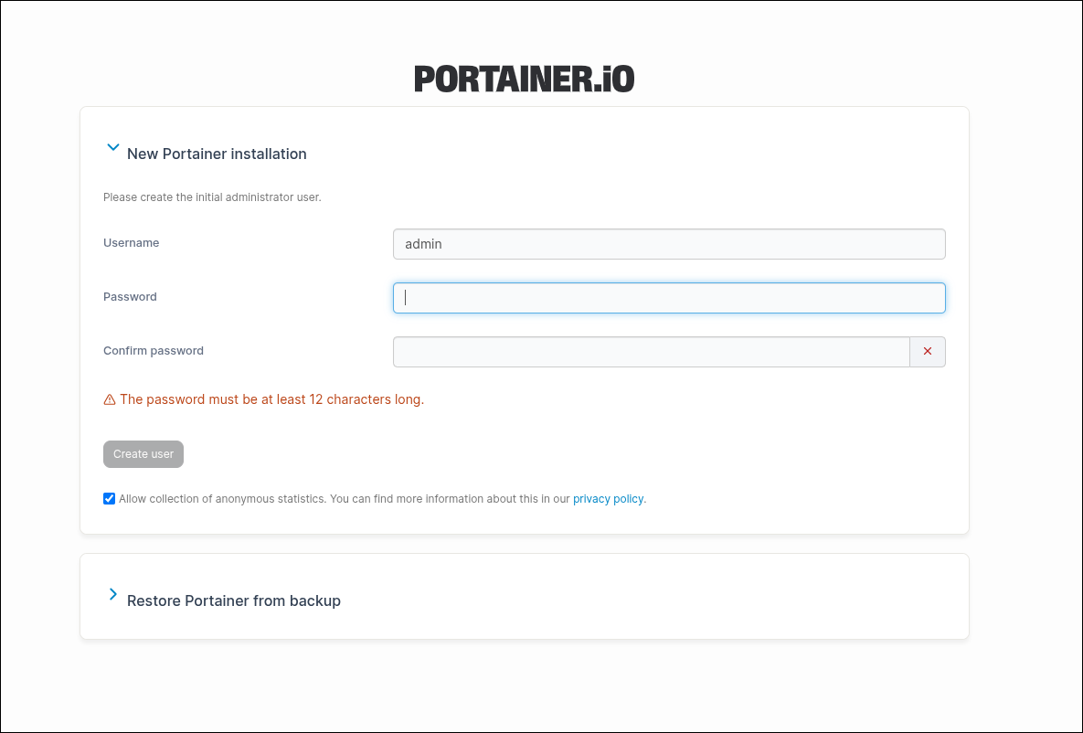 Будет открыта страница с веб-интерфейсом Portainer и формой для создания нового пользователя, под которым будет производиться вход в веб-интерфейс. Задайте имя пользователя и пароль. Пароль должен быть сложным и содержать не менее 12 символов.
