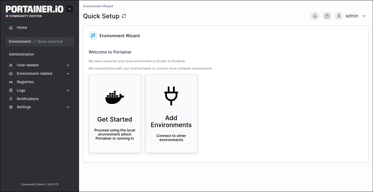 Кнопка «Get Started» подразумевает локальную работу с Portainer — все контейнеры будут запускаться локально (на текущей машине). Информация по локальной работе с Portainer приведена в пункте «Создание пользовательских контейнеров».