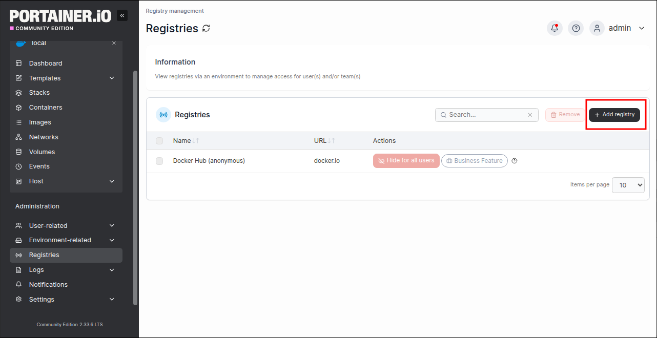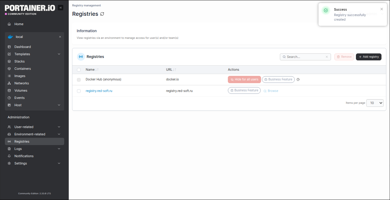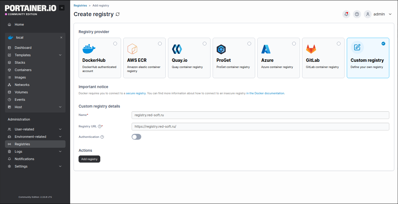 Для добавления внешнего реестра необходимо в разделе «Administration» открыть вкладку «Registries» и нажать «Add registry».