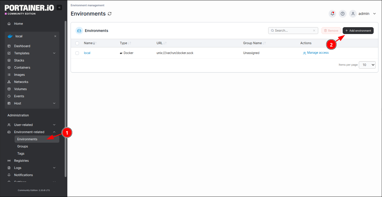 Для добавления агента в режиме Edge Agent в основном интерфейсе Portainer в разделе «Administration» откройте вкладку «Environment-related» — «Environments». Нажмите «Add environment».
