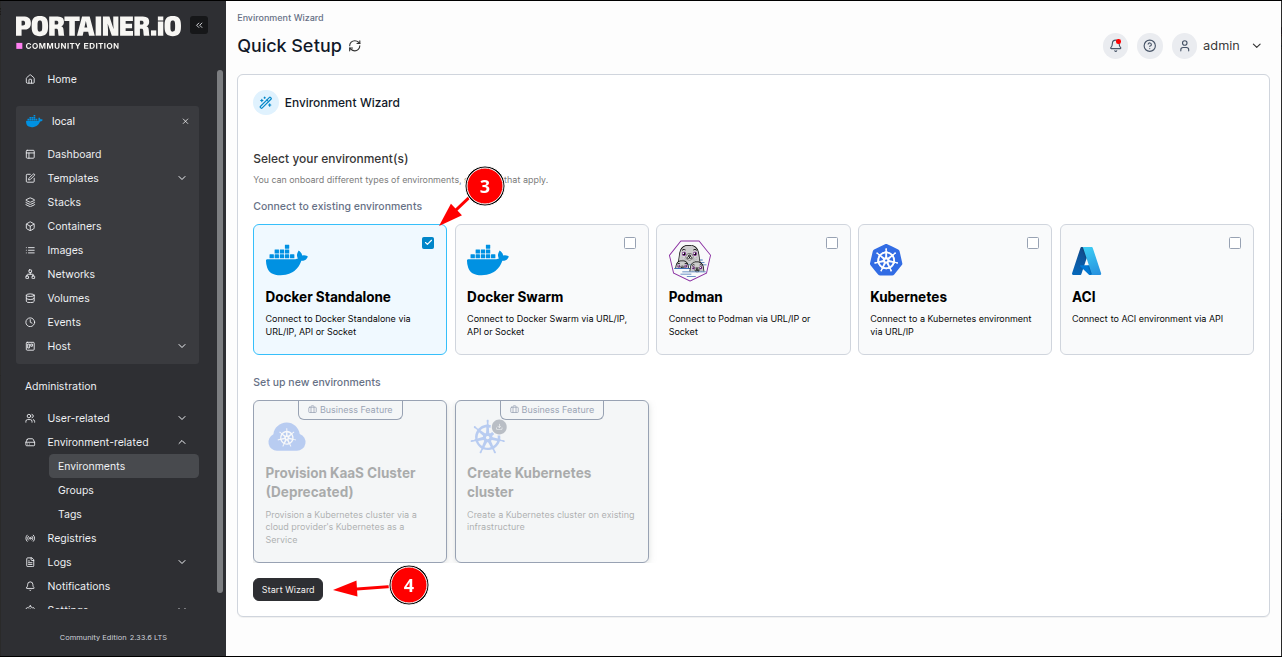 В открывшейся форме выберите окружение – Docker Standalone и нажмите «Start Wizard».