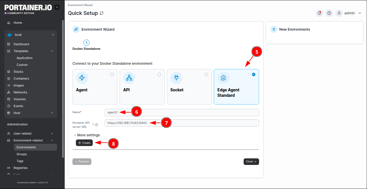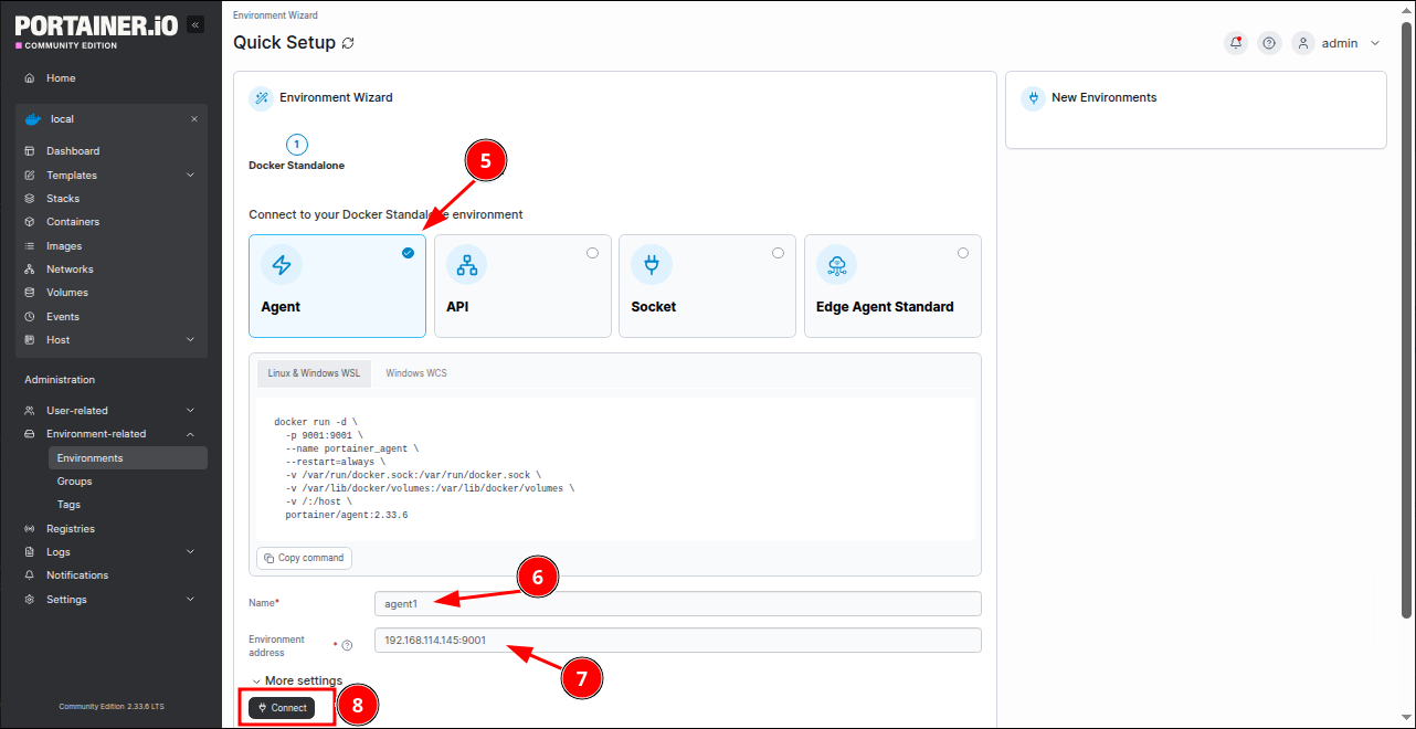 Для добавления агента в режиме Agent в основном интерфейсе Portainer в разделе «Administration» откройте вкладку «Environment-related» — «Environments». Нажмите «Add environment».