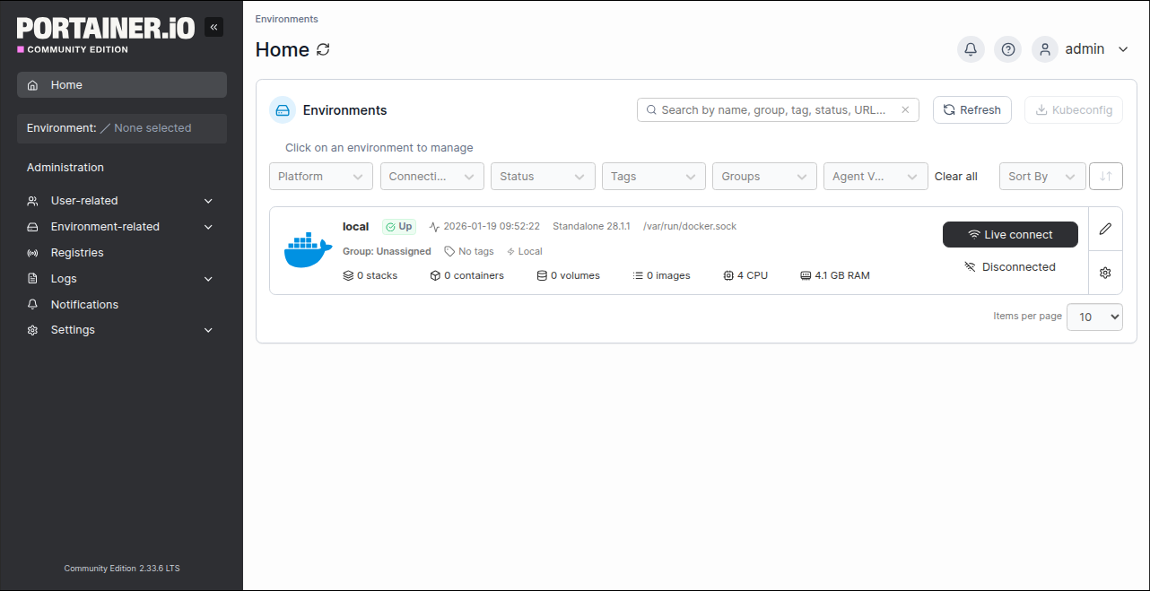 По нажатии кнопки «Get Started» на приветственной странице будет открыта страница с доступными окружениями Portainer – в текущем примере доступно окружение local — текущая машина, с установленным сервером Portainer.