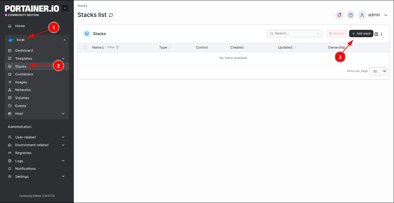 Для работы со стеками выберите любое доступное окружение и перейдите на вкладку «Stacks». Будет открыт список доступных стеков (изначально список пуст). Для добавления нового стека нажмите «Add stack».