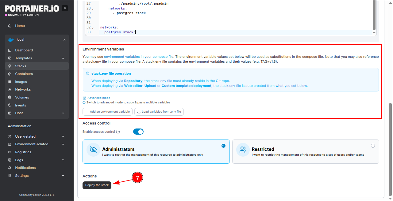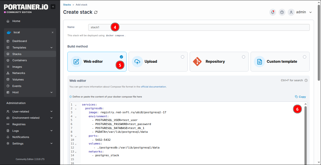 в поле редактора вставить содержимое compose-файла, описывающего стек.