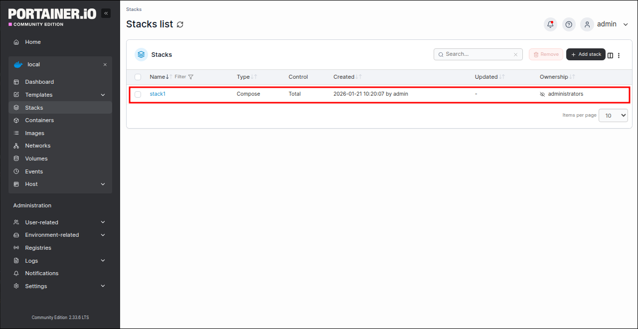 После определения всех необходимых параметров нажмите «Deploy the stack». Процесс развертывания стека займет некоторое время. По завершении процесса развертывания будет отображен список доступных стеков.