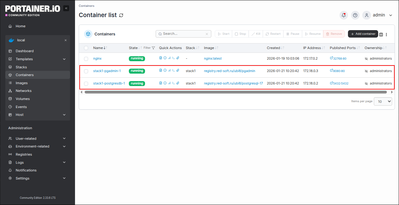 В рамках текущей инструкции в качестве примера будет развернута база данных PostgreSQL с графическим интерфейсом PgAdmin напрямую из Portainer.