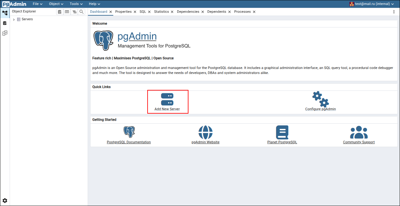 После авторизации будет открыта главная страница pgAdmin. Нажмите «Add New Server» для создания нового подключения к серверу.