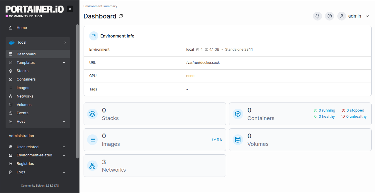 Для отображения более подробной информации о среде Portainer нажмите на имя окружения — local. На вкладке «Dashboard» доступна общая информация об окружении, такая как количество docker-образов, контейнеров, сетей, томов данных и пр.