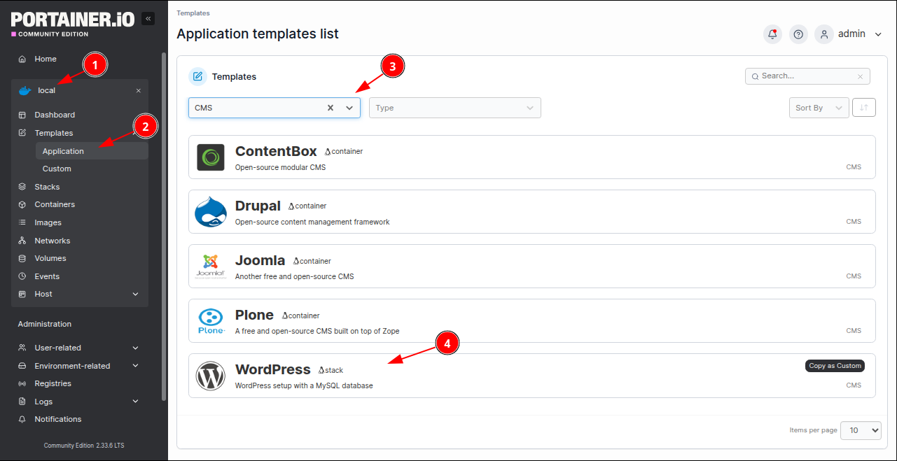 Для работы с шаблонами выберите любое доступное окружение и перейдите на вкладку «Templates» — «Application». В поле «Category» выберите CMS. Будет выведен список доступных шаблонов. Из списка выберите WordPress.