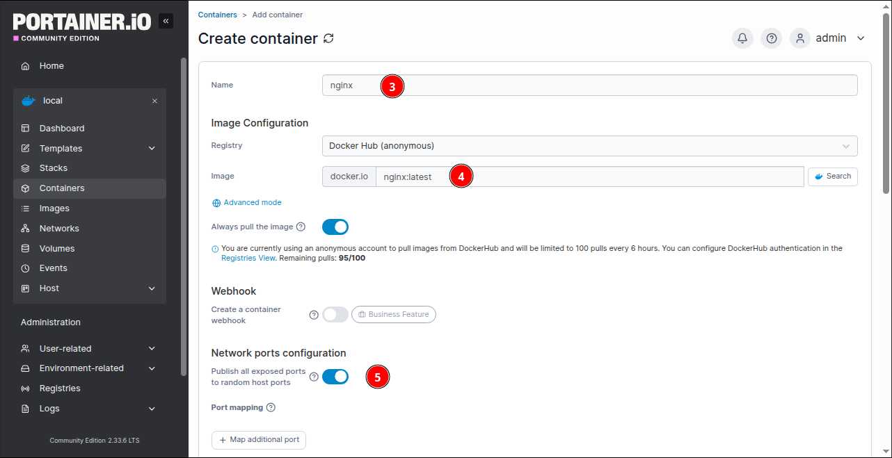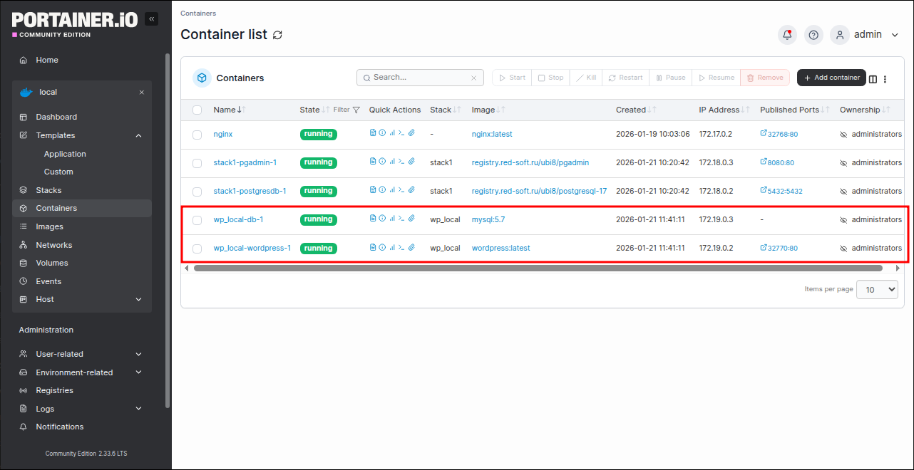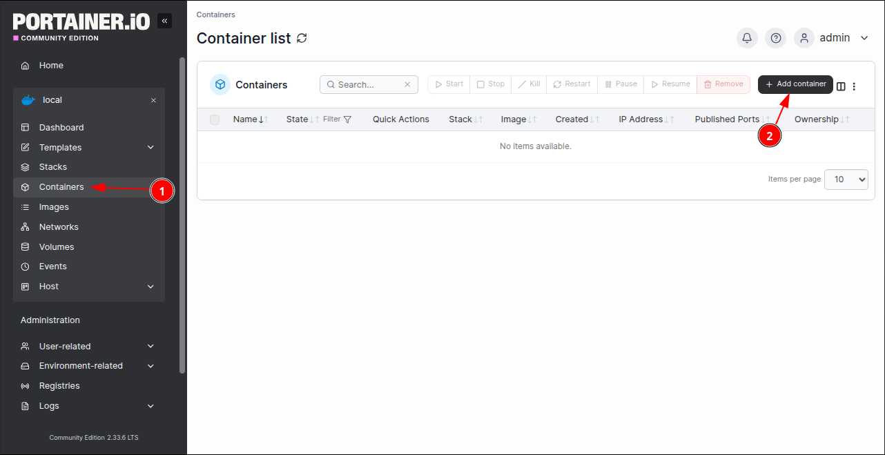 Portainer позволяет запускать контейнеры локально — на текущей машине с установленным сервером Portainer.