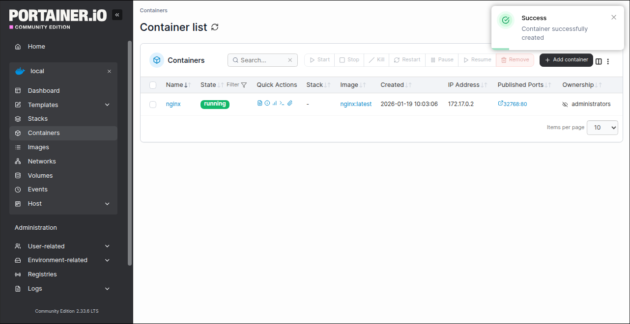 При успешном создании контейнера будет выведено соответствующее информационное сообщение, а также в списке контейнеров будет отображен его статус. При успешном запуске контейнера в статусе должно отображаться running.