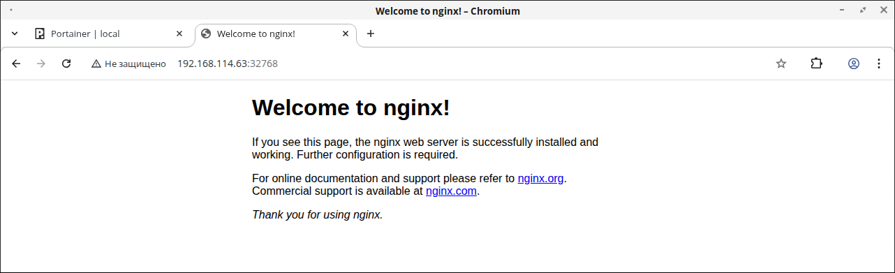 Для проверки корректности работы контейнера в поисковой строке браузера введите IP-адрес локальной машины и порт, который получил контейнер (в примере 32768).