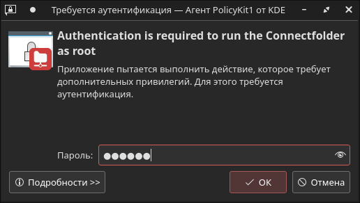 Работа с connectfolder требует прав администратора, поэтому во время запуска программы необходимо ввести пароль пользователя root.