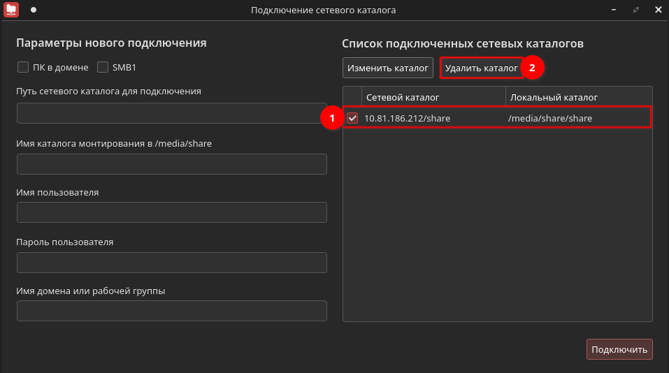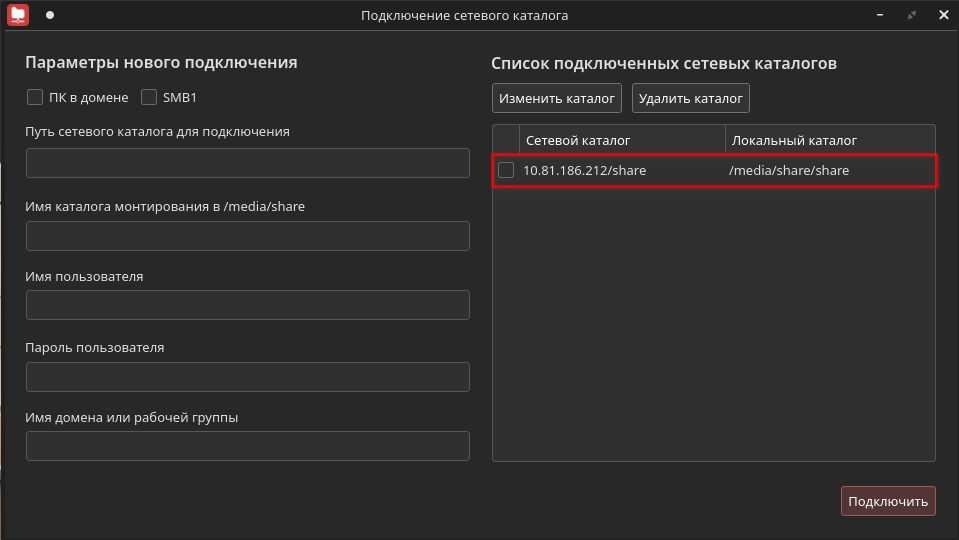 В данном примере после нажатия на кнопку «Подключить» инициализируется подключение (монтирование в linux) сетевого каталога «dc.win.redos/share» в локальную директорию /media/share/share. В случае успеха появится соответствующая запись в списке подключенных сетевых ресурсов.