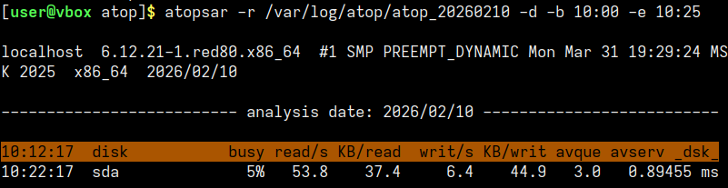 atopsar -r /var/log/atop/atop_20260210 -d -b 10:00 -e 10:25