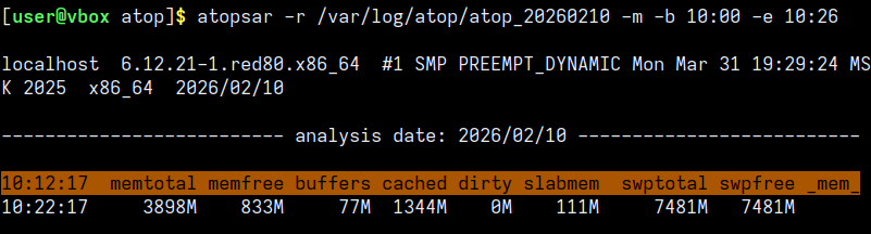 atopsar -r /var/log/atop/atop_20260210 -m -b 10:00 -e 10:26