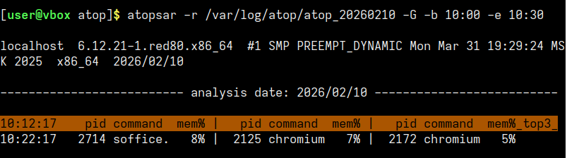 atopsar -r /var/log/atop/atop_20260210 -G -b 10:00 -e 10:30