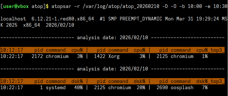 atopsar -r /var/log/atop/atop_20260210 -D -O -b 10:00 -e 10:30
