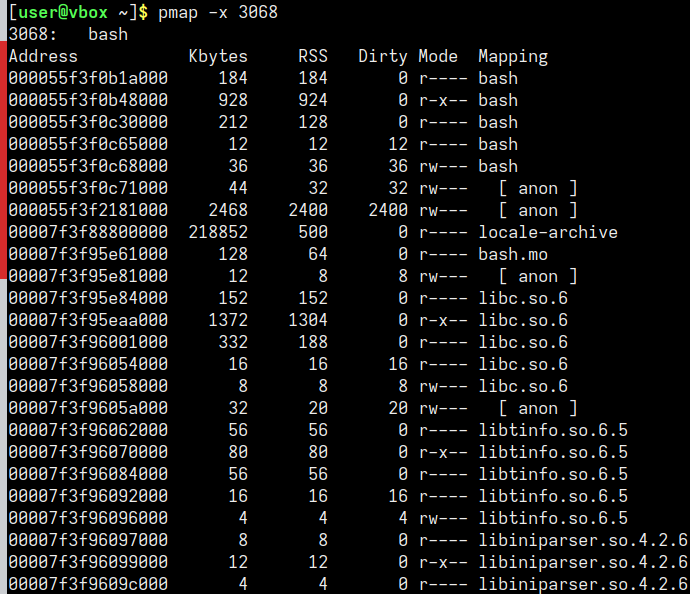 Команда pmap предоставляет подробную карту памяти, используемой процессом. Для работы с этой командой необходимо сначала найти идентификатор нужного процесса. Его можно получить командой ps, или даже командой top, если речь идет о процессе, потребляющем много процессорного времени.
