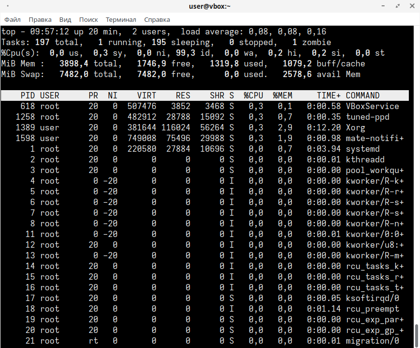 top — утилита, с помощью которой можно вывести список работающих в системе процессов и информацию о них. Данная утилита установлена в РЕД ОС по умолчанию.