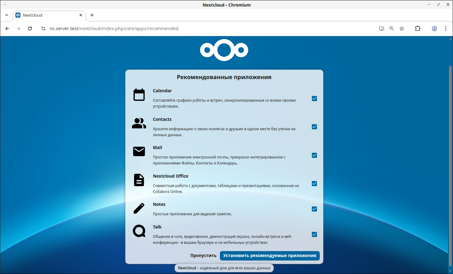 Далее нажмите «Установить». Установка занимает некоторое время. После завершения установки NextCloud будет предложено установить дополнительные приложения. Нажмите «Установить рекомендуемые приложения», чтобы установить приложения сразу, или выберите «Пропустить», чтобы установить их позднее.