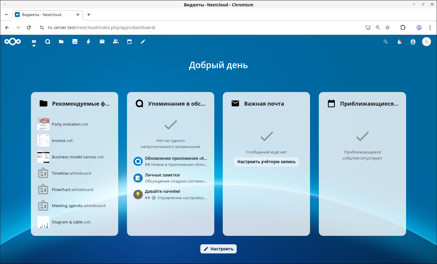 На данном этапе установка Nextcloud завершена. Главное приветственное окно будет выглядеть следующим образом: