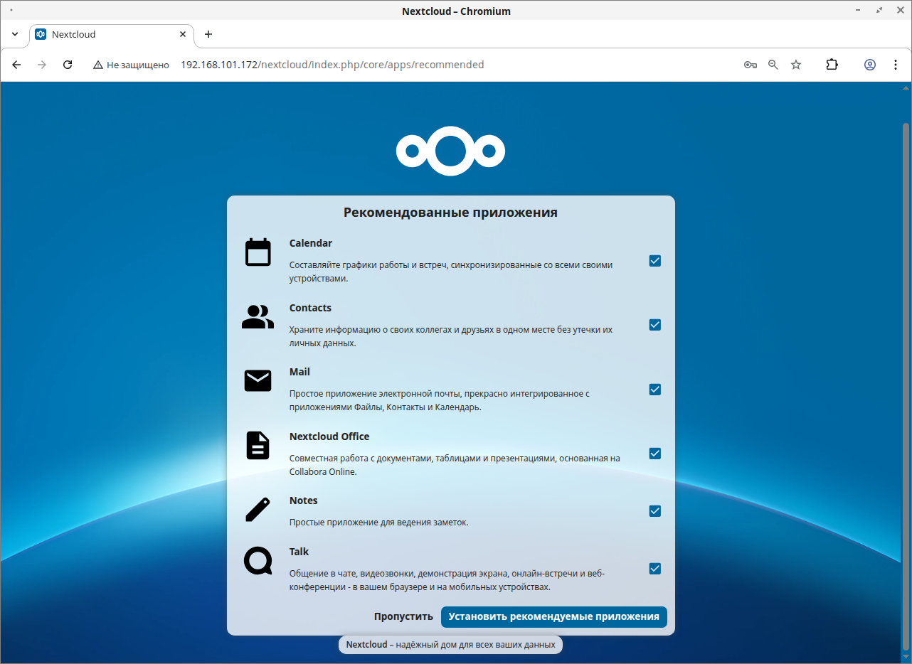 После завершения установки NextCloud будет предложено установить дополнительные приложения. Нажмите «Установить рекомендуемые приложения», чтобы установить приложения сразу, или выберите «Пропустить», чтобы установить их позднее.