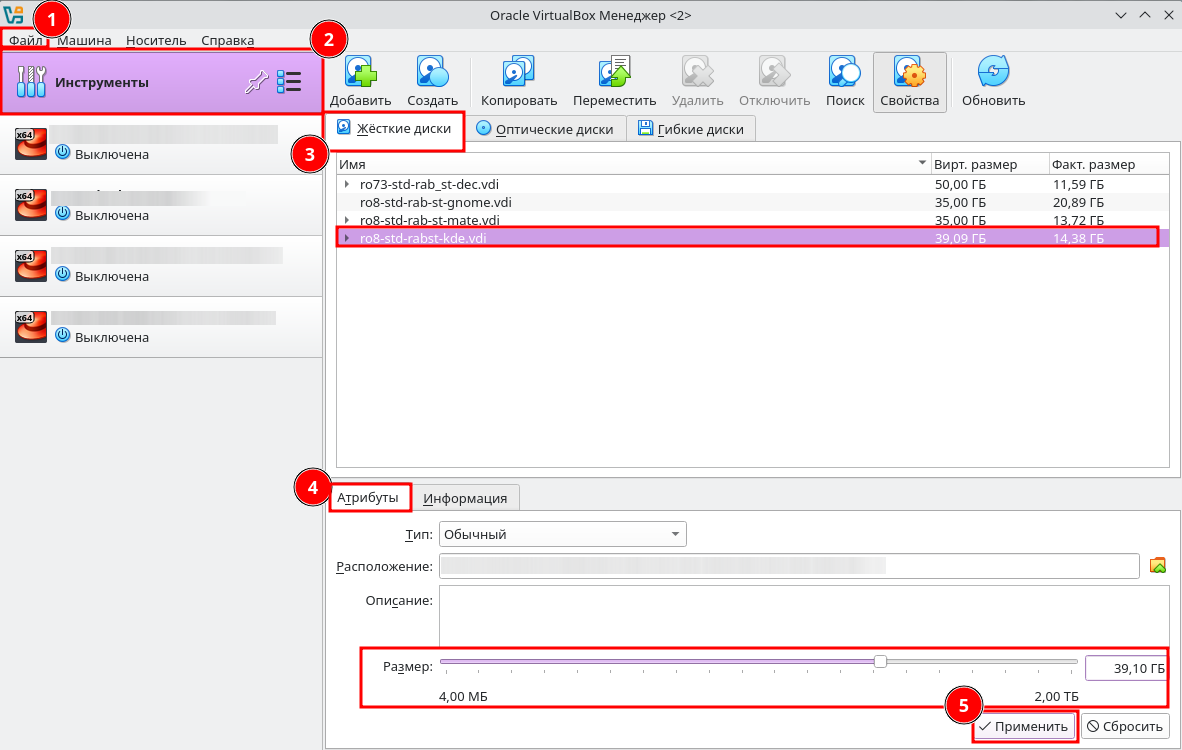 Для увеличения размера диска из меню графического менеджера виртуальных машин (если используемая версия Oracle VirtualBox поддерживает эту возможность) перейдите в меню «Файл» — «Инструменты» — «Менеджер виртуальных носителей». Во вкладке «Жесткие диски» выберите требуемый диск, во вкладке «Атрибуты» измените его размер и нажмите кнопку «Применить».