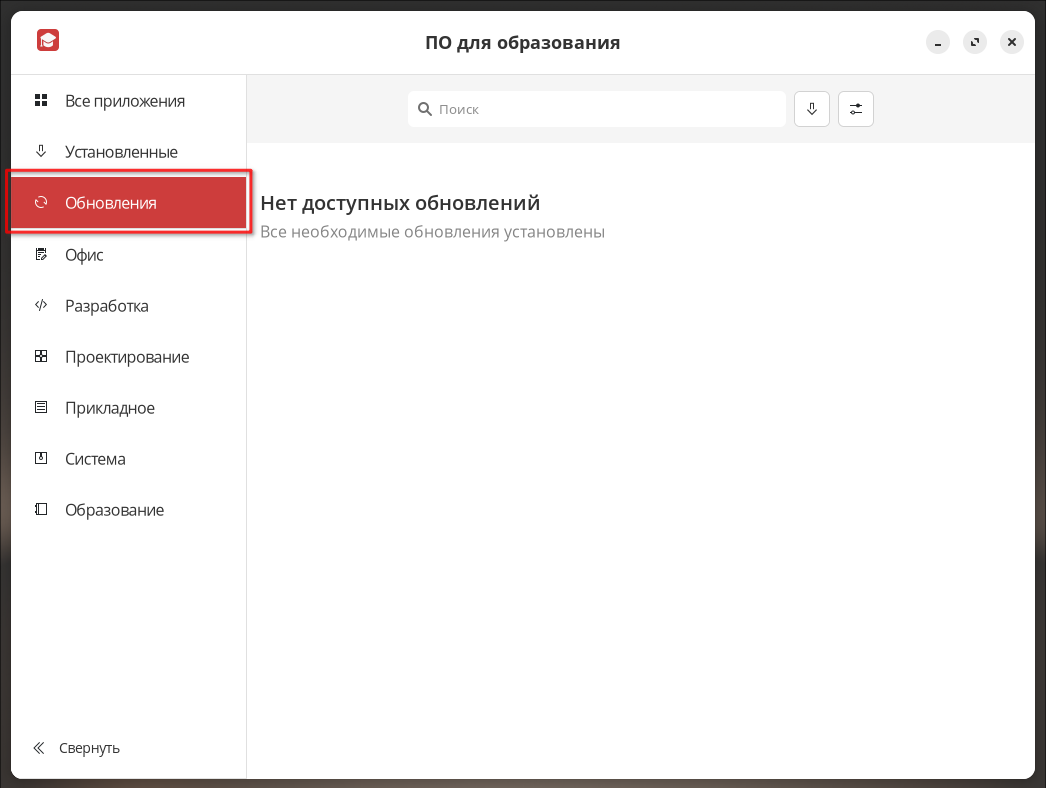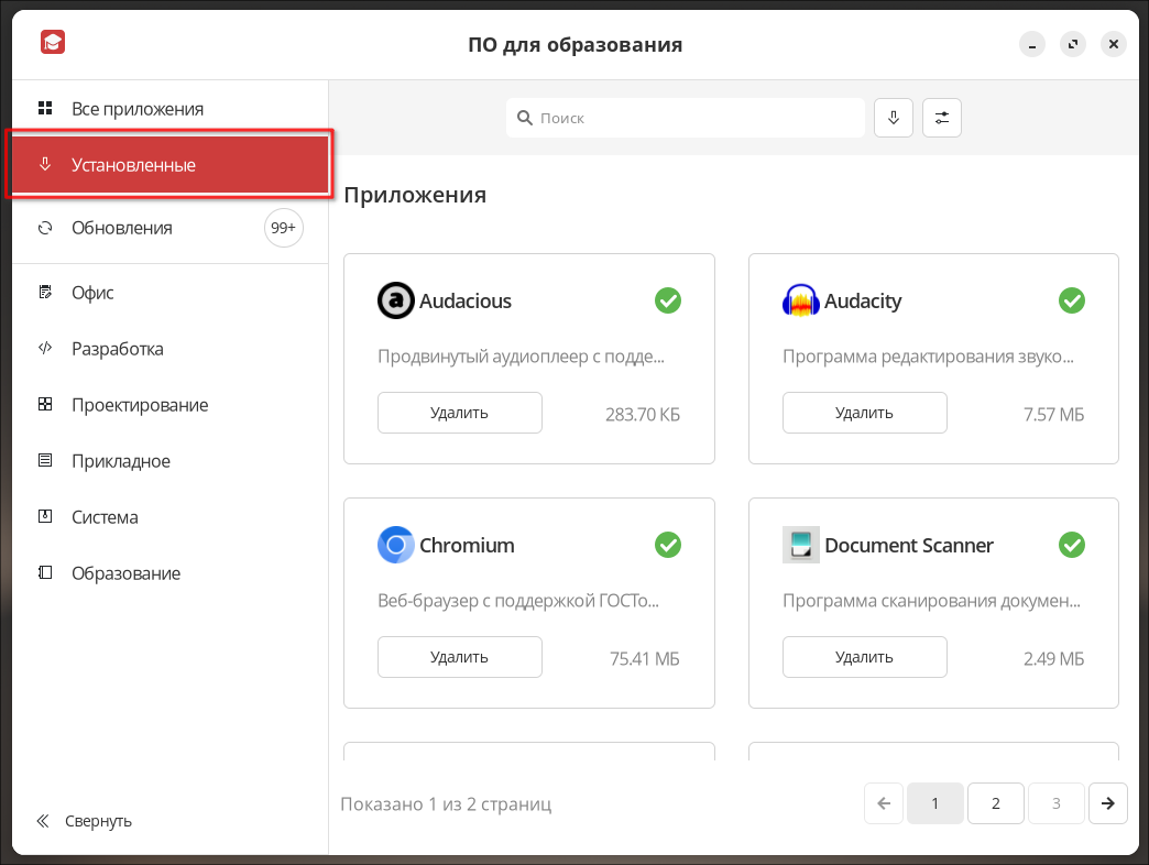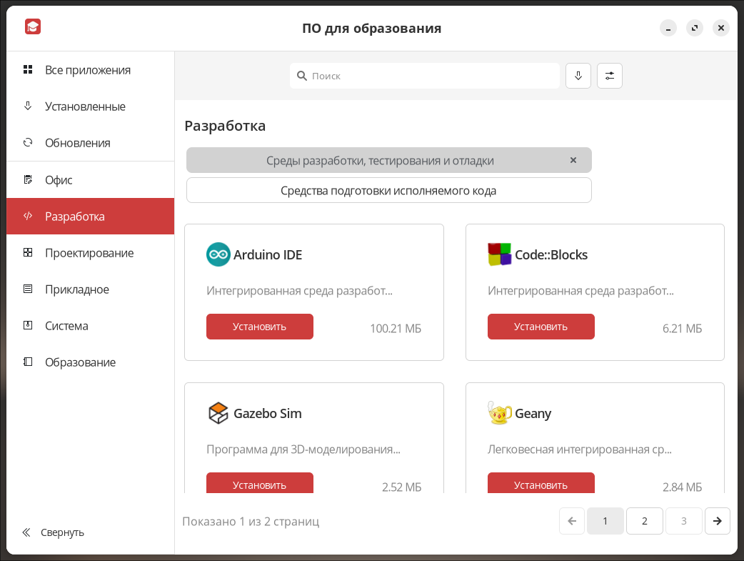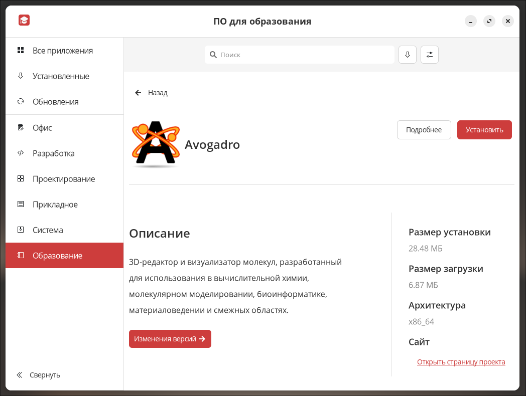 Центр приложений «ПО для образования» — программа (redos-education), специально разработанная для возможности установки, удаления и запуска ПО, используемого в учебном процессе. Список ПО, доступного в Центре приложений, можно просмотреть на странице «Программное обеспечение в репозитории РЕД ОС». Центр приложений устанавливается пакетом redos-education.