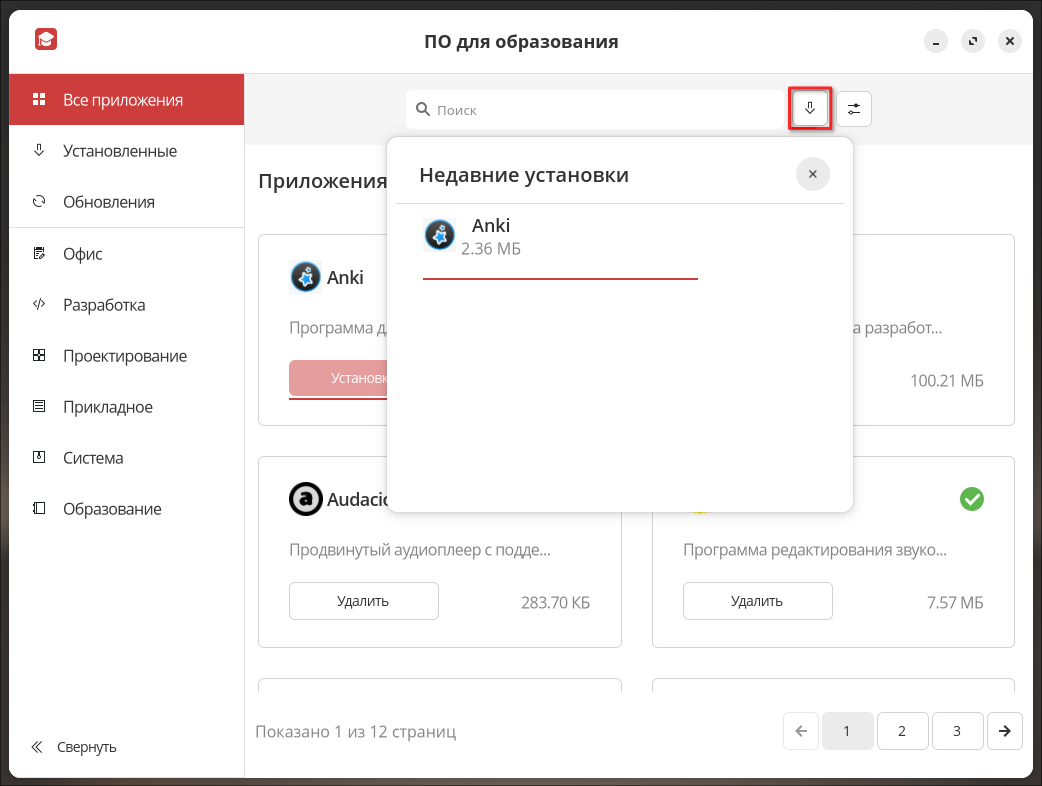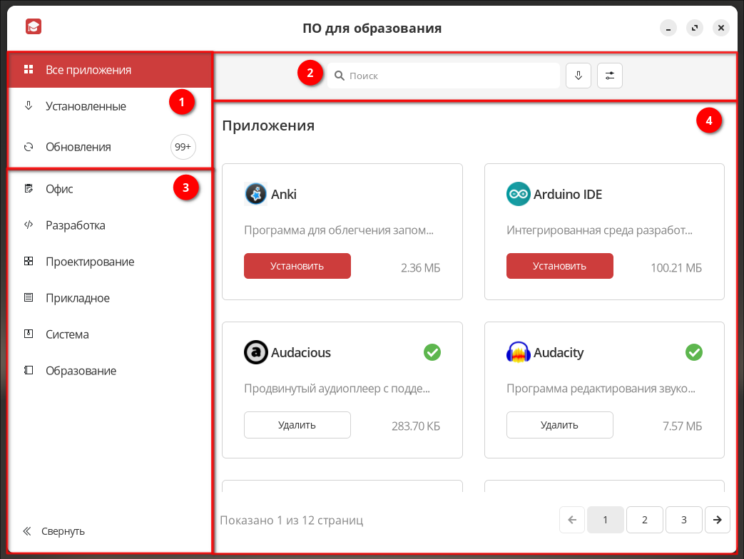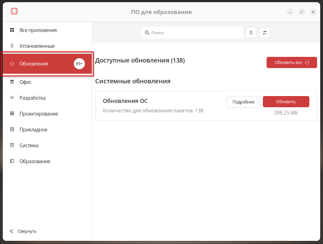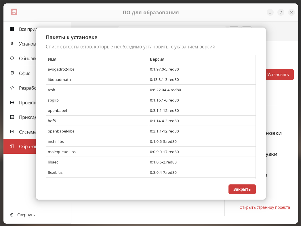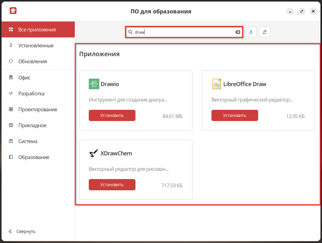 Центр приложений «ПО для образования» — программа (redos-education), специально разработанная для возможности установки, удаления и запуска ПО, используемого в учебном процессе. Список ПО, доступного в Центре приложений, можно просмотреть на странице «Программное обеспечение в репозитории РЕД ОС». Центр приложений устанавливается пакетом redos-education.