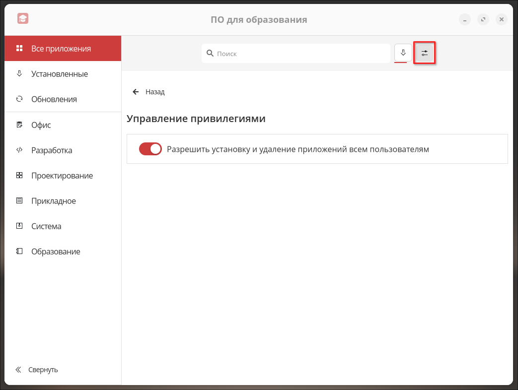Рядом находится раздел управления настройками приложения. В разделе Настройки доступен элемент управления привилегиями, активация которого разрешает всем пользователям системы установку и удаление программ (по умолчанию настройка активна). Изменение данной настройки доступно только при наличии прав администратора.