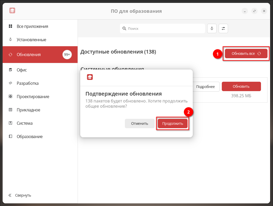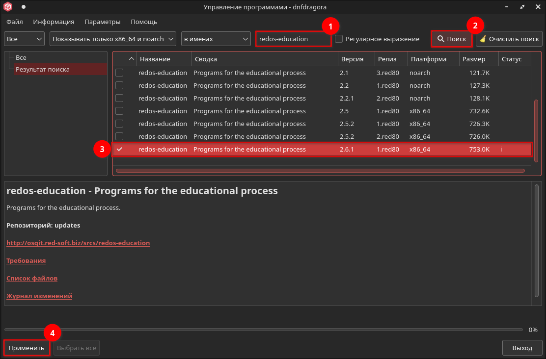 Для установки программы через графический менеджер пакетов dnfdragora перейдите в «Главное меню» — «Администрирование» — «Управление пакетами dnfdragora», выполните поиск необходимого пакета по ключевому слову «redos-education» и отметьте флагом пакет последней версии. После этого нажмите кнопку «Применить» и дождитесь окончания установки пакетов.