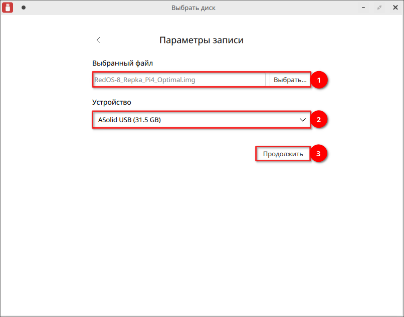 4. Выберите образ и устройство, на которое будет записан образ, затем нажмите «Продолжить».