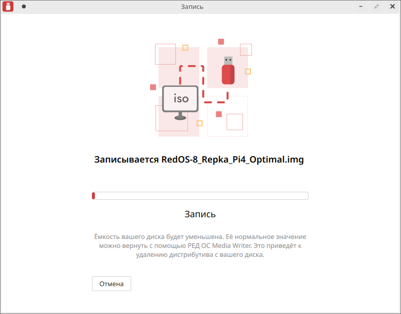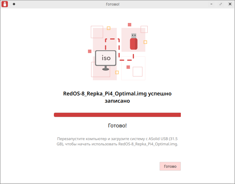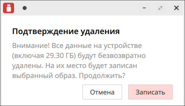 5. После подтверждения удаления выбранное устройство будет очищено, а образ для Repka Pi 4 Optimal записан. Нажмите «Записать».