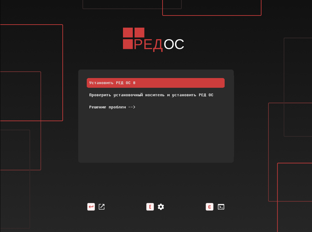 Чтобы начать процесс установки, нужно клавишами перемещения курсора «вверх»/«вниз» выбрать пункт меню «Установить РЕД ОС 8» и нажать Enter. В начальном загрузчике установлено небольшое время ожидания продолжительностью 1 минута. Если в этот момент не предпринимать никаких действий, то будет загружена установка системы с проверкой установочного носителя. Если пропущен нужный момент, нужно перезагрузить компьютер и до истечения установленного времени ожидания выбрать нужный пункт в меню загрузчика.