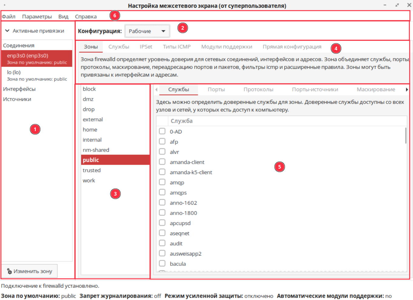 Главное окно firewall-config разделено на несколько функциональных областей: