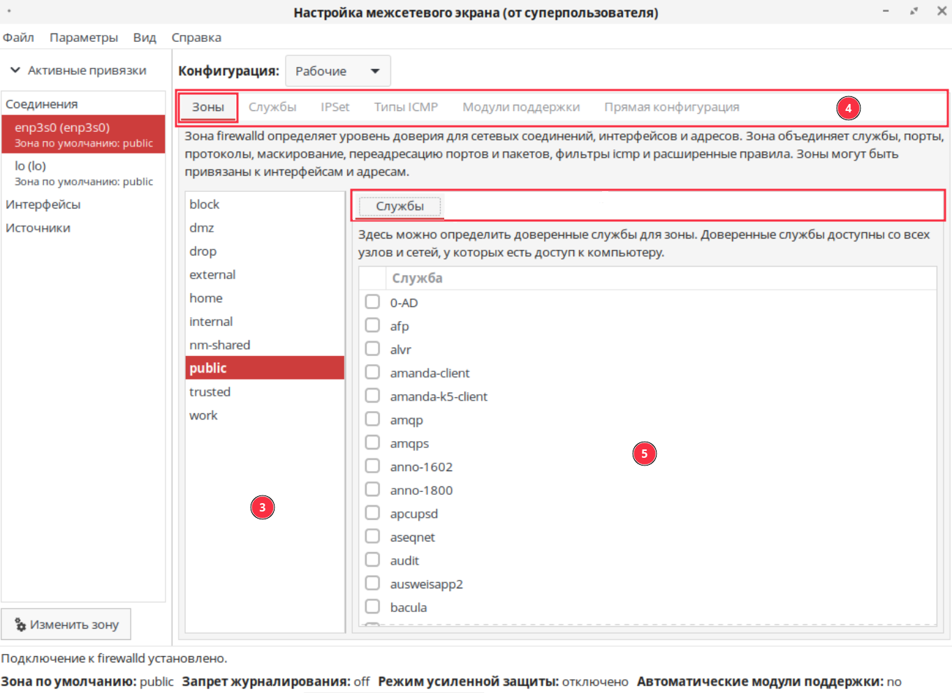«Службы» — позволяет настроить доступ к сетевым сервисам простым выбором службы из списка. В области (3) отображаются доступные службы, при выборе которых firewalld самостоятельно открывает все необходимые порты, протоколы и загружает вспомогательные модули: