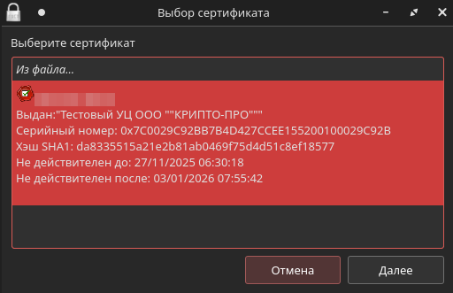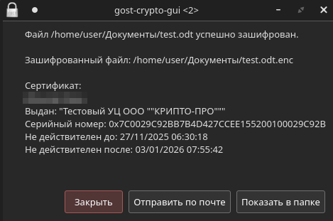 Для примера зашифруйте файл, но с использованием другого сертификата, размещённого на ключевом носителе Rutoken.